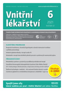 Vnitřní lékařství 2021 ROČNÍK 67 6 ISSN 0042–773X (print) / ISSN 1801–7592 (on-line) ČASOPIS ČESKÉ INTERNISTICKÉ SPOLEČNOSTI A SLOVENSKEJ INTERNISTICKEJ SPOLOČNOSTI Indexováno v: EMBASE.Excerpta Medica | SCOPUS | MEDLINE | Index Medicus | Bibliographia medica Čechoslovaca | Bibliographia medica Slovaca | Index Copernicus International | Chemical Abstracts | INIS Atomindex HLAVNÍ TÉMA: PNEUMOLOGIE Respirační insuficience, chronická hyperkapnie a domácí neinvazivní ventilace z pohledu pneumologa Inhalační glukokortikoidy v terapii covidu-19 Nintedanib v terapii intersticiálních plicních procesů u systémových onemocnění pojiva PŘEHLEDOVÉ ČLÁNKY Metabolický syndrom u pacientů po prodělané protinádorové terapii Hereditární hemoragická teleangiektázie (syndrom Osler-Weber-Rendu) Díl I. Patofyziologie, klinické příznaky a doporučený skríning cévních malfo rmací Špičkové technologie v medicíně – vliv nastavení hodnot alarmů u systé mů pro kontinuální monitoraci glykemie na metabolickou kompenzaci u diabetiků 1. typu: sy stematické review Spojili jsme sí ly Interní medicína pro praxi a Vnitřní lékařství pod jednou hlavičkou www.casopisvnitrnilekarstvi.cz Obsahuje i E VE RZ I