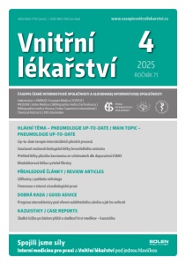 Vnitřní lékařství 2025 ROČNÍK 71 4 ISSN 0042-773X (print) / ISSN 1801-7592 (on-line) ČASOPIS ČESKÉ INTERNISTICKÉ SPOLEČNOSTI A SLOVENSKEJ INTERNISTICKEJ SPOLOČNOSTI Indexováno v: EMBASE: Excerpta Medica | SCOPUS | MEDLINE | Index Medicus | Bibliographia medica Čechoslovaca | Bibliographia medica Slovaca | Index Copernicus International | Chemical Abstracts | INIS Atomindex HLAVNÍ TÉMA – PNEUMOLOGIE UP-TO-DATE / MAIN TOPIC – PNEUMOLOGIE UP-TO-DATE Up-to-date terapie intersticiálních plicních procesů Současné možnosti biologické léčby bronchiálního astmatu Přehled léčby plicního karcinomu ve schématech dle doporučení ESMO Modulátorová léčba cystické fibrózy PŘEHLEDOVÉ ČLÁNKY / REVIEW ARTICLES Glifloziny z pohledu nefrologa Finerenon v interní a kardiologické praxi DOBRÁ RADA / GOOD ADVICE Progrese aterosklerózy pod vlivem subklinického zánětu a jak ho ovlivnit KAZUISTIKY / CASE REPORTS Sladká túžba po bielom plášti a sladkosť krvi medikov – kazuistika Spojili jsme síly Interní medicína pro praxi a Vnitřní lékařství pod jednou hlavičkou www.casopisvnitrnilekarstvi.cz