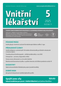 Vnitřní lékařství 2025 ROČNÍK 71 5 ISSN 0042-773X (print) / ISSN 1801-7592 (on-line) ČASOPIS ČESKÉ INTERNISTICKÉ SPOLEČNOSTI A SLOVENSKEJ INTERNISTICKEJ SPOLOČNOSTI Indexováno v: EMBASE: Excerpta Medica | SCOPUS | MEDLINE | Index Medicus | Bibliographia medica Čechoslovaca | Bibliographia medica Slovaca | Index Copernicus International | Chemical Abstracts | INIS Atomindex PŮVODNÍ PRÁCE Inzulin glargin v kontextu současné farmakoterapie diabetu mellitu 2. typu PŘEHLEDOVÉ ČLÁNKY Umělá inteligence v primární péči: Od redukce dimenzionality po klinické rozhodování a časovou úsporu Transthyretinová kardiomyopatie – přehled problematiky v roce 2025 Osteoporóza – prevence, diagnostika a léčba Venous excess ultrasound a co vše zatím (ne)víme Monitorování koncentrace kyslíku s využitím Internetu věcí během pandemie covidu-19 KAZUISTIKY Úplná atrioventrikulární blokáda jako projev lymeské karditidy DOBRÁ RADA Jak správně interpretovat výsledky lipidového profilu Spojili jsme síly Interní medicína pro praxi a Vnitřní lékařství pod jednou hlavičkou www.casopisvnitrnilekarstvi.cz