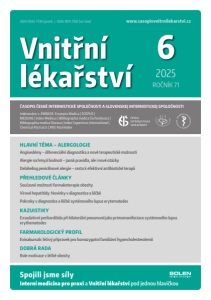 Vnitřní lékařství 2025 ROČNÍK 71 6 ISSN 0042-773X (print) / ISSN 1801-7592 (on-line) ČASOPIS ČESKÉ INTERNISTICKÉ SPOLEČNOSTI A SLOVENSKEJ INTERNISTICKEJ SPOLOČNOSTI Indexováno v: EMBASE: Excerpta Medica | SCOPUS | MEDLINE | Index Medicus | Bibliographia medica Čechoslovaca | Bibliographia medica Slovaca | Index Copernicus International | Chemical Abstracts | INIS Atomindex HLAVNÍ TÉMA – ALERGOLOGIE Angioedémy – diferenciální diagnostika a nové terapeutické možnosti Alergie na hmyzí bodnutí – jasná pravidla, ale i nové otázky Delabeling penicilinové alergie – cesta k efektivní antibiotické terapii PŘEHLEDOVÉ ČLÁNKY Současné možnosti farmakoterapie obezity Virové hepatitidy: Novinky v diagnostice a léčbě Pokroky v diagnostice a léčbě systémového lupus erytematodes KAZUISTIKY Exsudativní perikarditida při bilaterální pneumonii jako primomanifestace systémového lupus erythematodes FARMAKOLOGICKÝ PROFIL Evinakumab: léčivý přípravek pro homozygotní familiární hypercholesterolemii DOBRÁ RADA Role motivace v léčbě obezity Spojili jsme síly Interní medicína pro praxi a Vnitřní lékařství pod jednou hlavičkou www.casopisvnitrnilekarstvi.cz