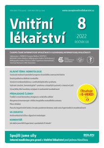 Vnitřní lékařství 2022 ROČNÍK 68 8 ISSN 0042-773X (print) / ISSN 1801-7592 (on-line) ČASOPIS ČESKÉ INTERNISTICKÉ SPOLEČNOSTI A SLOVENSKEJ INTERNISTICKEJ SPOLOČNOSTI Indexováno v: EMBASE.Excerpta Medica | SCOPUS | MEDLINE | Index Medicus | Bibliographia medica Čechoslovaca | Bibliographia medica Slovaca | Index Copernicus International | Chemical Abstracts | INIS Atomindex HLAVNÍ TÉMA: HEMATOLOGIE Současné možnosti zpomalení progrese chronického onemocnění ledvin Dnešní pohled na dědičné trombofilie Venózní tromboembolismus u antifosfolipidového syndromu Vybrané závažné „hematologické“ syndromy u dospělých pacientů v intenzivní péči Vývoj léčby žilní trombózy od pijavic k mechanické trombektomii PŘEHLEDOVÉ ČLÁNKY Tradiční a nové biomarkery kongesce u srdečního selhání Alergenová imunoterapie v léčbě alergického eozinofilního astmatu Plicní střádání Porucha kognitivních funkcí a hrozba pandemie demence aneb cesta hypertoniků k nesoběstačnosti VE ZKRATCE Antitrombotická léčba a digestivní endoskopie KOMENTÁŘ Jak dobře jsme léčili hypertenzi v posledních 25 letech? Spojili jsme sí ly Interní medicína pro praxi a Vnitřní lékařství pod jednou hlavičkou www.casopisvnitrnilekarstvi.cz Obsahuje i E VERZI