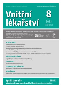 Vnitřní lékařství 2025 ROČNÍK 71 8 ISSN 0042-773X (print) / ISSN 1801-7592 (on-line) ČASOPIS ČESKÉ INTERNISTICKÉ SPOLEČNOSTI A SLOVENSKEJ INTERNISTICKEJ SPOLOČNOSTI Indexováno v: EMBASE: Excerpta Medica | SCOPUS | MEDLINE | Index Medicus | Bibliographia medica Čechoslovaca | Bibliographia medica Slovaca | Index Copernicus International | Chemical Abstracts | INIS Atomindex HLAVNÍ TÉMA Endokrinní disruptory a diabetes mellitus Karcinom pankreatu a diabetes mellitus Imunitně zprostředkovaný diabetes mellitus indukovaný checkpoint inhibitory: kazuistiky a klinický přehled pro internisty Kardio-reno-metabolický syndrom a jeho management v klinické praxi Nevyužitý potenciál inovativní léčby diabetu 2. typu – náklady na zbytné kardiorenální komplikace PŘEHLEDOVÉ ČLÁNKY Angioedém jako nežádoucí účinek léčby různými farmaky KAZUISTIKY Akutní jaterní selhání po albendazolu FARMAKOLOGICKÝ PROFIL Mirikizumab v paletě léčiv idiopatických střevních zánětů DOBRÁ RADA Proč může být vhodné u pacientů s chronickým onemocněním ledvin nahradit rosuvastatin atorvastatinen? Spojili jsme síly Interní medicína pro praxi a Vnitřní lékařství pod jednou hlavičkou www.casopisvnitrnilekarstvi.cz